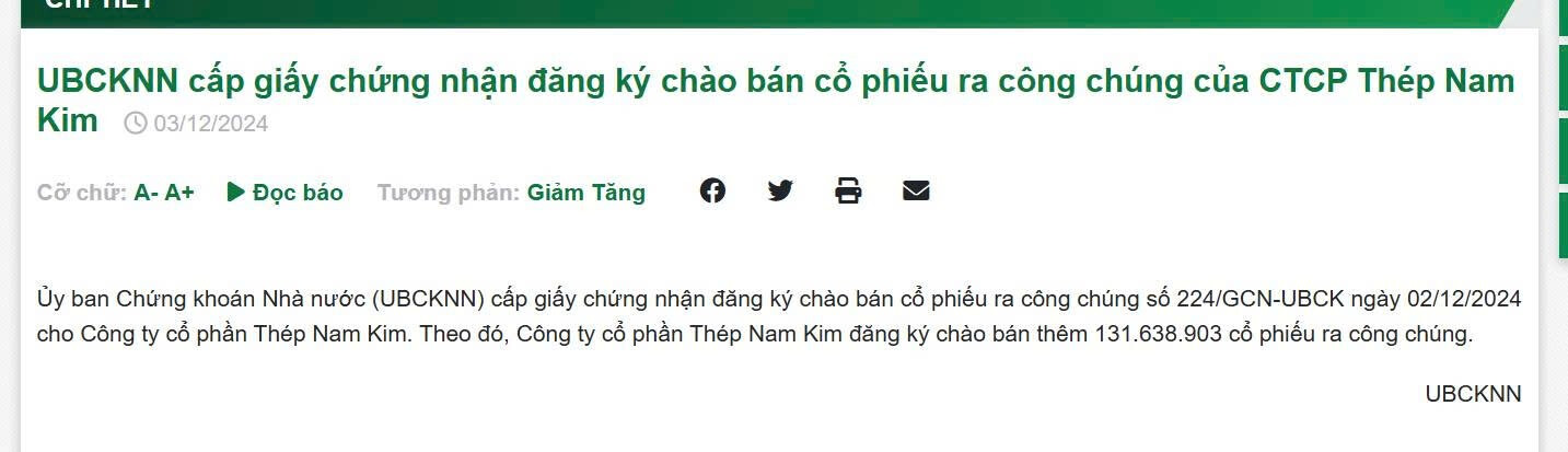 NKG đã được UBCK chấp thuận đăng ký chào bán cổ phiếu cho cổ đông hiện hữu
