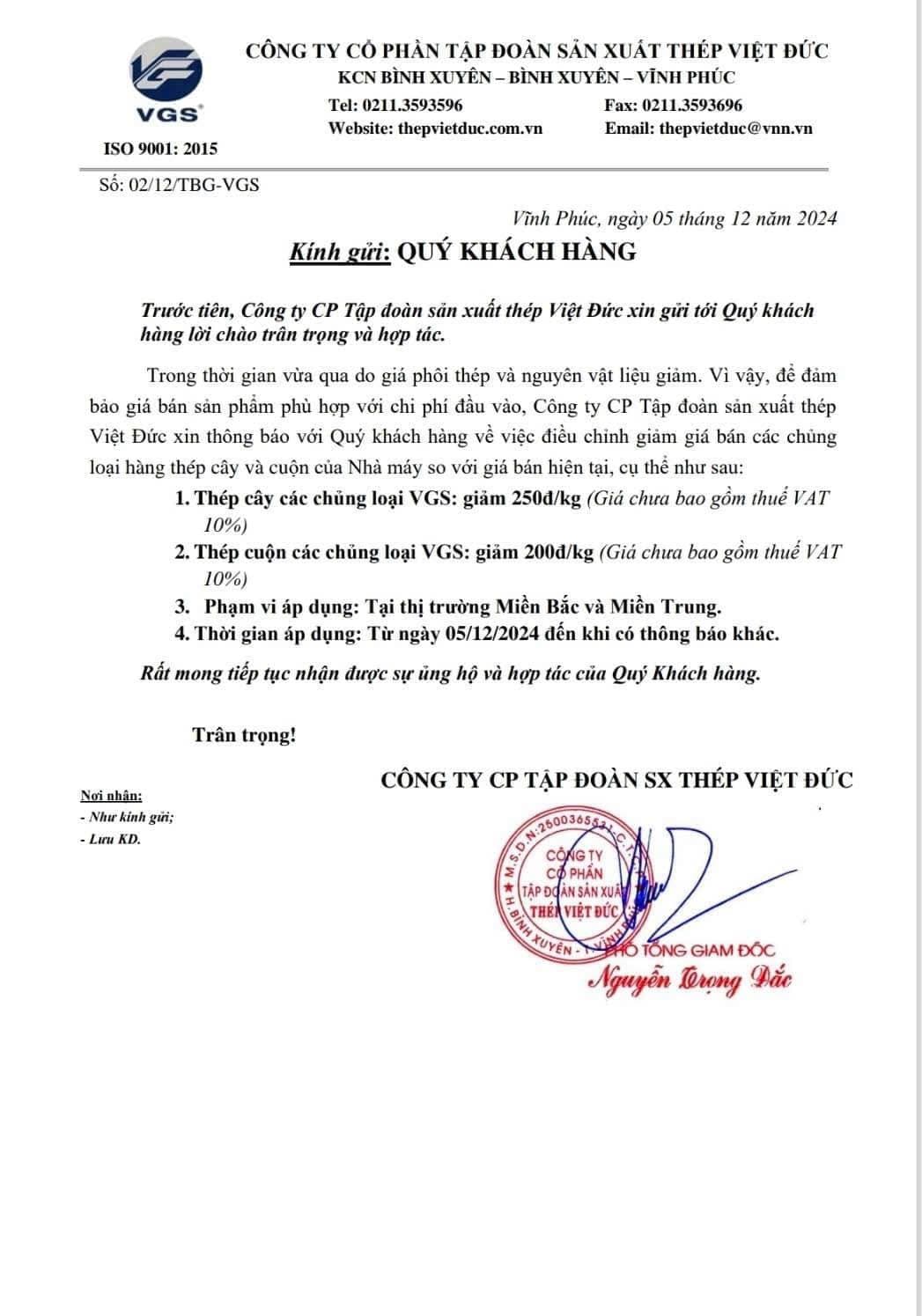 Một số công ty thép xây dựng thông báo giảm giá bán từ ngày 5/12.