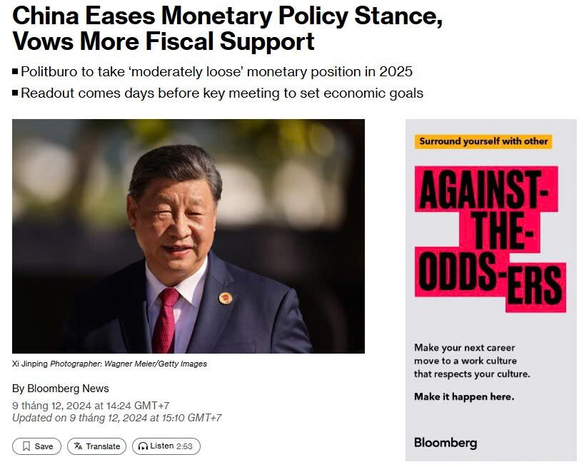 Bộ Chính trị gồm 24 thành viên do Chủ tịch Tập Cận Bình đứng đầu đã tuyên bố sẽ áp dụng chiến lược “nới lỏng vừa phải” cho chính sách tiền tệ vào năm 2025, đánh dấu sự thay đổi lớn đầu tiên về lập trường kể từ năm 2011.