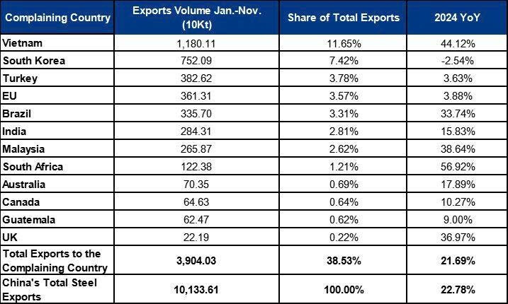 Trong 11 tháng đầu năm 2024, Trung Quốc đã xuất khẩu 101,3 triệu tấn thép (+22,8% svck), trong đó có 39 triệu tấn (chiếm 38,5%) đến các quốc gia có liên quan đến các vụ kiện thương mại đối với thép TQ.