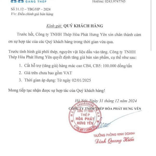 HPG thông báo điều chỉnh cắt hỗ trợ một số sản phẩm thép xây dựng, đồng nghĩa tăng giá bán kể từ đầu năm 2025.