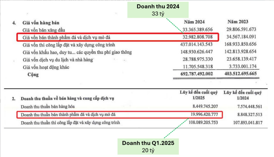 Doanh thu riêng quý 1/2025 đã là 20 tỷ (mà mới chỉ đến từ 1 mỏ đá Xuân Hòa thôi), nếu H ước tính khiêm tốn 1 năm 80 tỷ doanh thu, mỏ Thiên Tân đi vào hoạt động cũng tạo ra 80 tỷ doanh thu tương ứng thì Tổng cộng doanh thu mảng đá dự kiến 160 tỷ