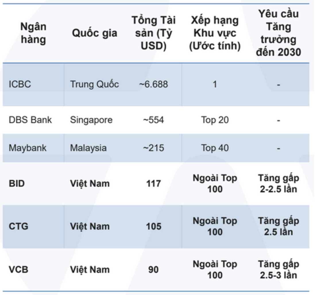 Vietcombank (VCB) được dự báo sẽ là đại diện đầu tiên đạt chuẩn Top 100 châu Á nhờ hiệu quả hoạt động và chất lượng tài sản ổn định. Trong khi đó, BIDV và VietinBank dù sở hữu quy mô tài sản lớn, nhưng có hệ số CAR mỏng hơn, sẽ hưởng lợi trực tiếp từ dòng vốn tái đầu tư để tăng tốc mở rộng quy mô. Bên cạnh đó, VCB nhận chuyển giao bắt buộc ngân hàng CBBank (hiện là VCB Neo) khiến phải chia sẻ một phần tăng trưởng tín dụng cho ngân hàng này trong năm nay dẫn tới không tăng trưởng lợi nhuận tốt so với năm ngoái. Dự kiến năm sau việc này sẽ không còn giúp dư địa tăng trưởng tốt hơn của VCB.