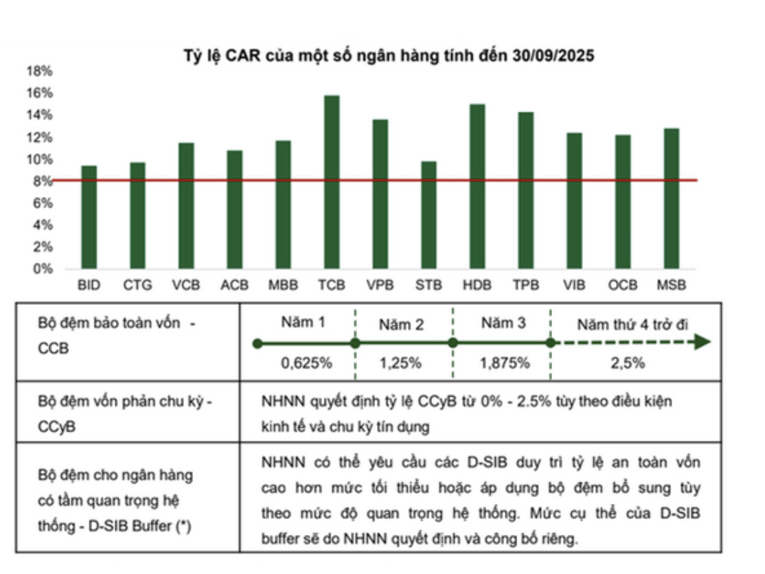 - Theo số liệu của VCBS, hầu hết các ngân hàng đều đang có tỷ lệ CAR trên 10%, ngoại trừ nhóm ngân hàng quốc doanh, là những ngân hàng có tầm quan trọng trong D-SIB (Domestic Systemically Important Banks, ngân hàng có tầm quan trọng hệ thống trong nước).