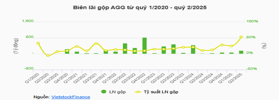 Giá vốn giảm sâu giúp lãi gộp vượt 165 tỷ đồng, kéo biên lãi gộp từ 16% lên 85% – mức cao nhất của doanh nghiệp. Các chi phí tài chính, bán hàng và quản lý doanh nghiệp chỉ còn 85 tỷ đồng, giảm 34%. Nhờ vậy, AGG báo lãi ròng gần 81 tỷ đồng, gấp 40 lần so với cùng kỳ năm 2024.
