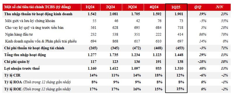 Trong quý 1/2025, TCBS tiếp tục duy trì hiệu quả sinh lời cao với tỷ suất lợi nhuận trên vốn chủ sở hữu (ROE) đạt 15% và tỷ suất lợi nhuận trên tổng tài sản (ROA) đạt 8% - thuộc nhóm cao nhất ngành. Việc duy trì kết quả lợi nhuận tăng trưởng ổn định trong thời gian dài nhờ TCBS đã thành công đa dạng hóa các nguồn thu nhập khác nhau bao gồm từ cổ phiếu, trái phiếu, chứng chỉ quỹ và các sản phẩm khác.