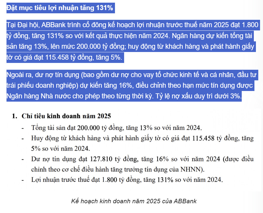 “Lợi nhuận trước thuế năm 2024 của ABBANK tăng 58% so với năm 2023, đạt 809 tỷ đồng, nhưng mới chỉ hoàn thành 81% kế hoạch năm mà cổ đông giao phó. Kết quả kinh doanh chưa đạt kỳ vọng khiến lãnh đạo Ngân hàng nhìn nhận được nhiều điểm hạn chế trong quá trình điều hành, phần nào cho thấy hệ thống còn cồng kềnh, chồng chéo, tốn nhiều chi phí và việc tinh gọn có hiệu quả là nhiệm vụ cấp bách”, Chủ tịch ABBANK Đào Mạnh Kháng chia sẻ trước đại hội.