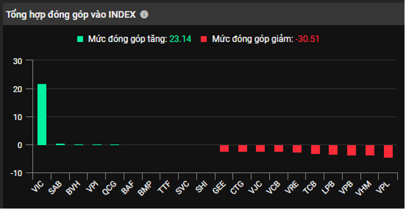 Đã nói quá nhiều về việc Vin đóng góp vào chỉ số như thế nào. Nhưng rõ ràng nếu đổ lỗi cho VIN thì chưa đủ. Nếu nhìn trong tuần qua, VIC đã bù trừ cho cả VPL + VHM + VRE và một vài cổ phiếu trụ khác. Đồng nghĩa với đà giảm ~100 điểm của thị trường phần lớn đến từ CHÍNH các cổ phiếu điều chỉnh.