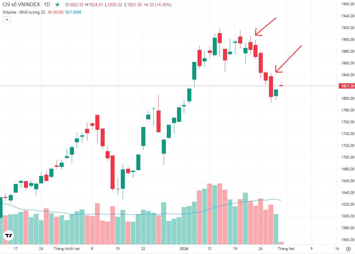 VNINDEX đóng cửa 1.830,50 điểm (-13,22 | -0,72%), tiếp tục giảm nhưng biên độ đã thu hẹp đáng kể so với phiên 26/01, thanh khoản ~25.100 tỷ cho thấy áp lực bán có dấu hiệu suy yếu.