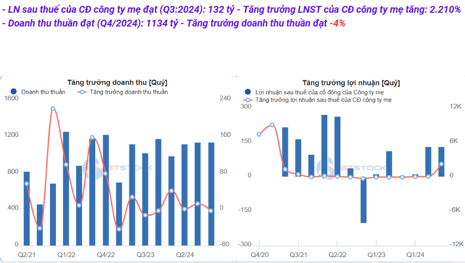 - Doanh thu thuần đạt (Q4/2024): 1134 tỷ - Tăng trưởng doanh thu thuần đạt -4%