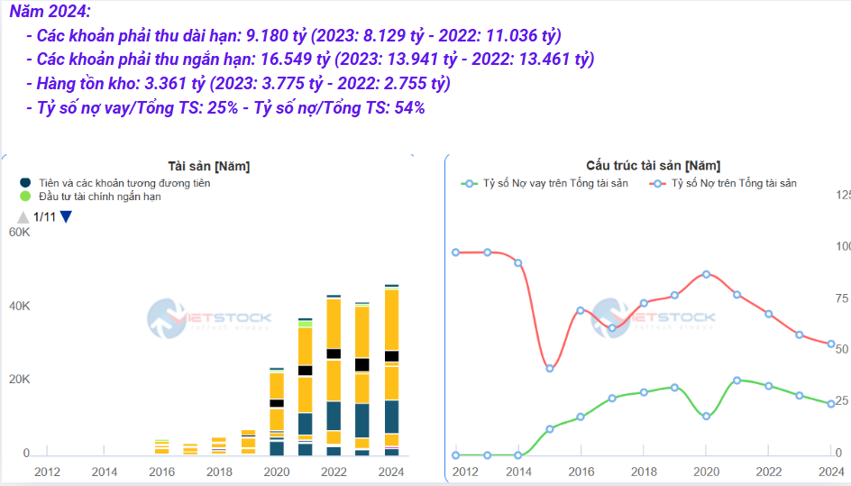 - Các khoản phải thu ngắn hạn: 16.549 tỷ (2023: 13.941 tỷ - 2022: 13.461 tỷ)