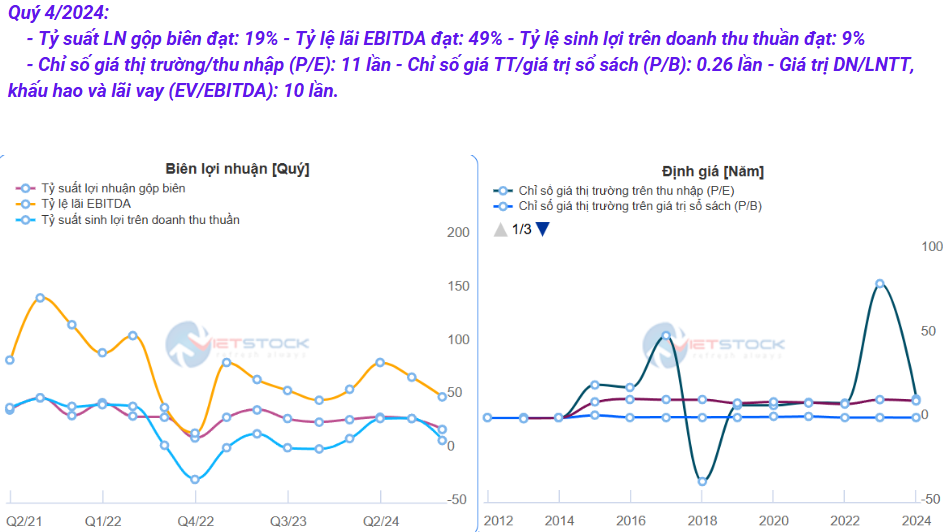 Quý 4/2024:- Tỷ suất LN gộp biên đạt: 19% - Tỷ lệ lãi EBITDA đạt: 49% - Tỷ lệ sinh lợi trên doanh thu thuần đạt: 9%
