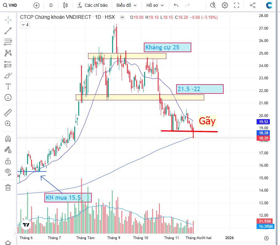 Hôm qua anh chị có thể không tin đó là điểm mua tuyệt vời của VND nói riêng và nhóm chứng nói chung - khi tất cả mã nhóm này bị bán gãy nền/đáy/hỗ trợ! Bởi vì hôm qua anh chị sẽ thấy bức tranh là cổ phiếu gãy - bị bán mạnh - giảm giá mạnh. Bức tranh ấy bao trùm lên anh chị tâm lý bi quan! Khiến anh chị quên rằng DN này vẫn thế - giá đã chiết khấu 30% - nhiều kì vọng phía trước.