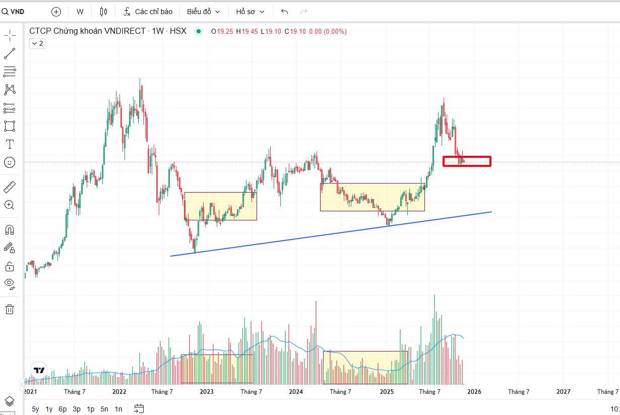 VND - Phiên nay cho thấy cân bằng 3 đáy. Thanh khoản kiệt. Thời gian tích lũy đi ngang gần 4 tuần.