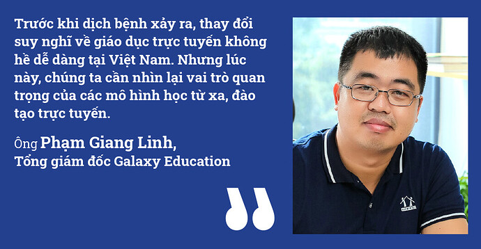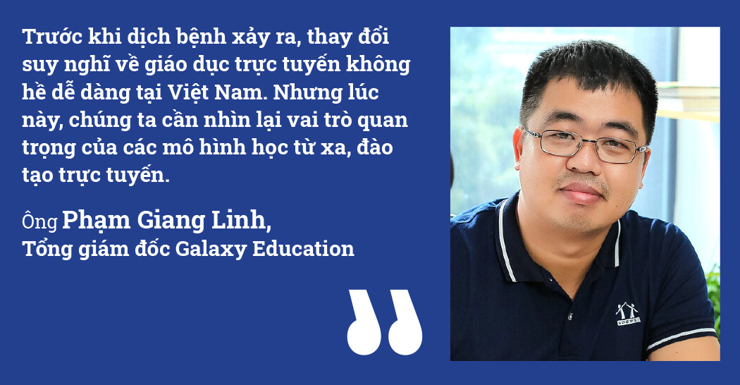 “Trước khi dịch bệnh xảy ra, thay đổi suy nghĩ về giáo dục trực tuyến không hề dễ dàng tại Việt Nam. Nhưng lúc này, chúng ta cần nhìn lại vai trò quan trọng của các mô hình học từ xa, đào tạo trực tuyến. Qua khảo sát của Bộ Giáo dục và Đào tạo, hơn 80% trường học có chuyển đổi sang mô hình học tập trực tuyến”, ông Phạm Giang Linh, Tổng giám đốc Galaxy Education, cho biết.