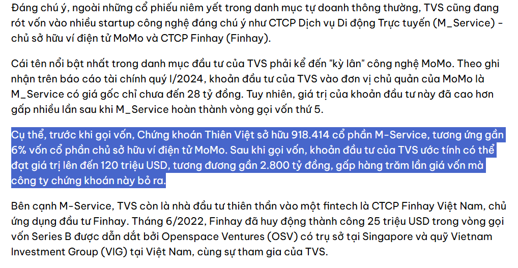 TVS cho biết giá gốc của khoản đầu tư vào startup này vào năm 2007 là 27,85 tỷ đồng, tương đương 30.000 đồng/cp. Thương vụ trên khiến giá trị một cổ phiếu M-Service tăng lên 2,5-2,8 triệu đồng. Điều này có nghĩa là giá trị của khoản đầu tư vào MoMo của TVS đã tăng gấp trăm lần chỉ sau 14 năm. Tại thời điểm 30/6/2021, TVS sở hữu hơn 918.414 cổ phiếu phổ thông, tương đương gần 6% cổ phần. Với mức định giá hơn 2 tỷ USD, tài sản của nhà đầu tư thiên thần Thiên Việt tại MoMo hiện có giá trị khoảng 120 triệu USD.