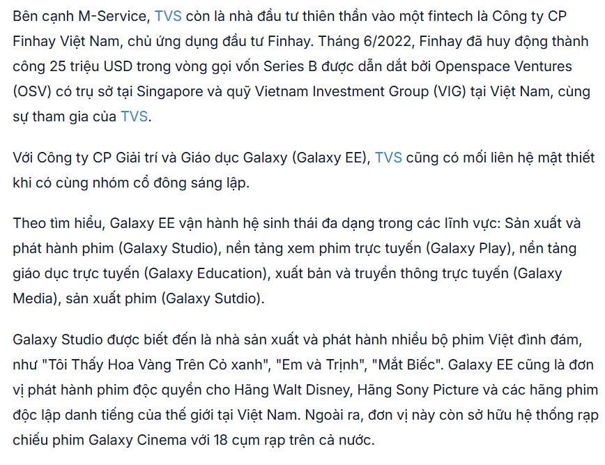 M-Service là khoản đầu tư mà Ban lãnh đạo TVS luôn tự hào mỗi khi nhắc đến. Cổ phiếu TVS đã bắt đầu tăng mạnh từ đầu năm 2021 sau khi MoMo hoàn tất vòng gọi vốn Series D với số tiền được cho là xấp xỉ 100 triệu USD. Tính từ đầu năm 2021, thị giá cổ phiếu TVS tăng gần 500%.