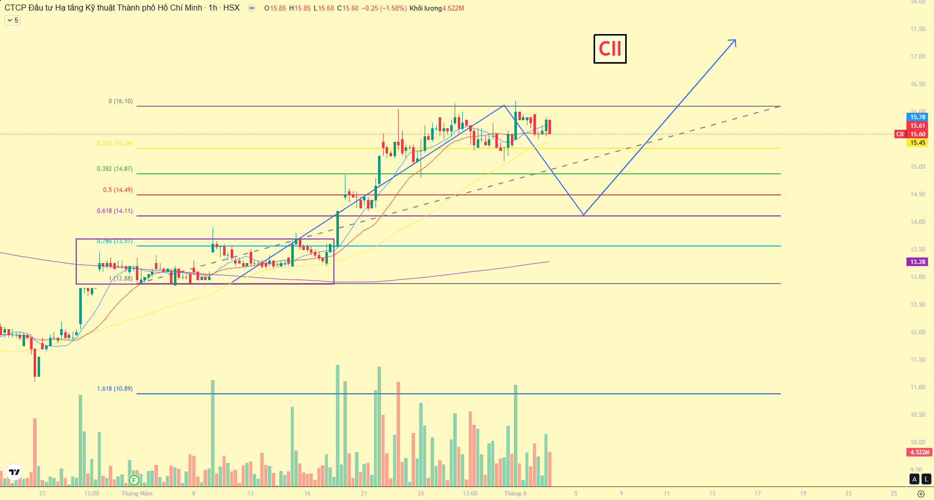 Về biểu đồ của CII, dao động quanh vùng 15.45 – 15.60, sát với Fibonacci 0.236 và phía trên các mức hỗ trợ quan trọng. Nếu CII giữ vững vùng 15.0 – 15.45, xác suất cao sẽ hình thành sóng tăng tiếp theo Sóng 3 hướng về mục tiêu 16.10 (Fibo 1.0).