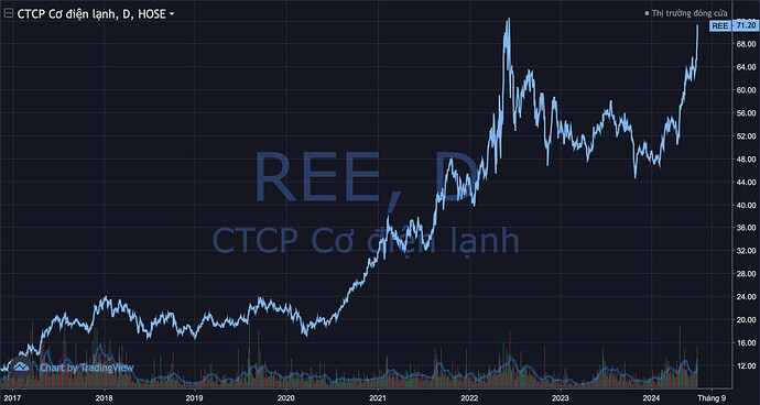 Cổ phiếu REE của CTCP Cơ điện lạnh vừa có cú ngược dòng đầy ấn tượng khi tăng 2,45% phiên 10/7 lên mức 71.200 đồng/cp, áp mức đỉnh lịch sử đạt được hồi giữa tháng 6/2022 (tính theo giá điều chỉnh). Từ đầu năm, cổ phiếu này đã tăng gần 50% thị giá. Vốn hóa thị trường tương ứng đạt xấp xỉ 33.500 tỷ đồng (1,3 tỷ USD), tăng 10.600 từ đầu năm đến nay.