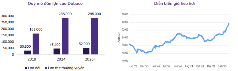 Bên cạnh đó, giá lợn hơi được dự báo sẽ tiếp tục duy trì ở mức cao ít nhất trong nửa đầu năm 2025. Kể từ sau Tết Nguyên Đán, giá lợn hơi đã tăng 17% do dịch tả lợn châu Phi diễn biến phức tạp, ảnh hưởng lớn đến nguồn cung. Hiện nay, giá lợn hơi dao động trong khoảng 75.000 - 82.000 đồng/kg. Dự báo giá lợn hơi sẽ tiếp tục ở mức cao đến giữa năm 2025 do hai yếu tố chính: (i) dịch tả lợn châu Phi khiến việc tái đàn chưa thể diễn ra trên diện rộng, làm giảm nguồn cung; (ii) nền kinh tế phục hồi và tăng trưởng sẽ kích thích nhu cầu tiêu thụ từ người tiêu dùng.
