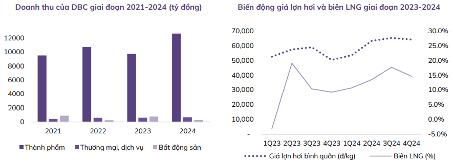 Doanh thu bán thành phẩm TACN và chăn nuôi của DBC chiếm tỷ trọng lớn nhất trong cơ cấu doanh thu. Năm 2024, doanh thu bán thành phẩm của DBC đạt 12.647 tỷ đồng (+29,8% svck), chiếm 93% tổng doanh thu.