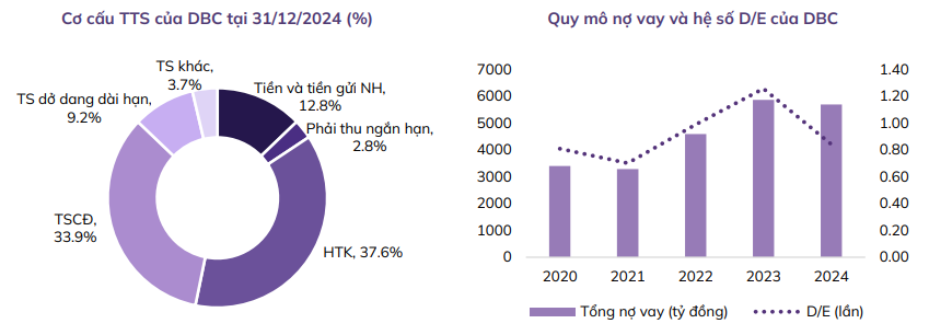 Mảng bất động sản của DBC biến động khá lớn do đây không phải mảng kinh doanh chính của DBC và phụ thuộc vào tiến độ bàn giao các dự án. Trong năm 2024, DBC không có dự án bất động sản nào lớn được hoàn thành và bàn giao.