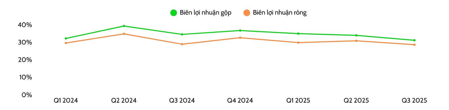 Lượng tiền và tương đương tiền đạt trên 13.000 tỷ đồng, chiếm 67% tổng tài sản. Lượng tiền mặt dồi dào này giúp doanh nghiệp đảm bảo vốn triển khai các dự án sắp tới. Mặc dù khoản vay ngắn hạn đã gia tăng gấp đôi so với đầu năm để tài trợ cho việc nhập nguyên vật liệu đầu vào, tỷ lệ nợ vay D/E cuối Q3/2025 vẫn ở mức an toàn
