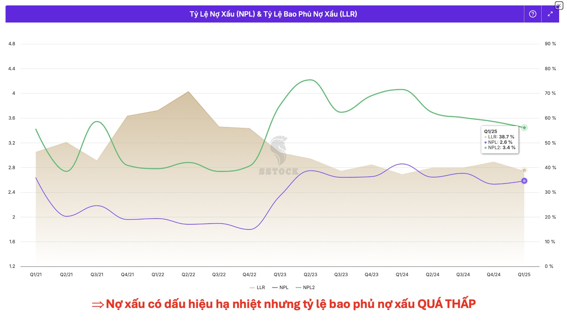 Tỷ lệ bao phủ nợ xấu chỉ đạt 39% – mức rất thấp so với mặt bằng chung của ngành (đa số >100%)