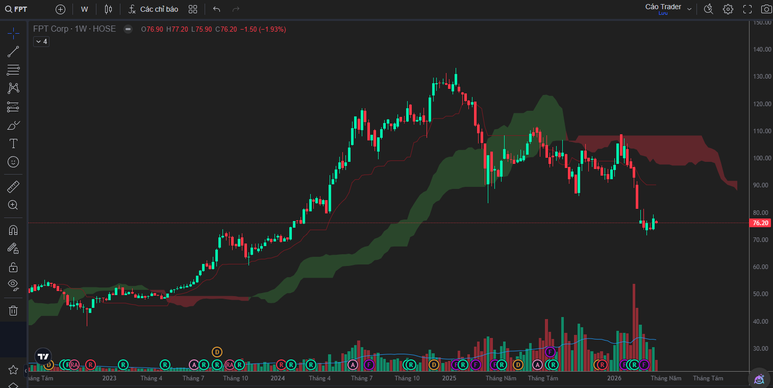 Hệ thống Ichimoku trên khung tuần đang phản ánh bức tranh kỹ thuật tương đối thận trọng đối với FPT.