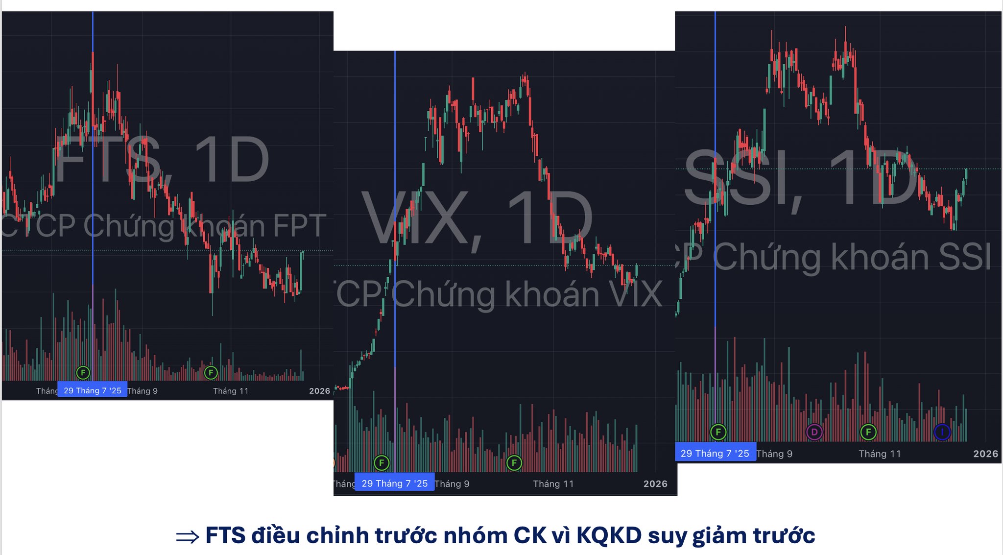 Trong khi đa số CTCK khác vẫn có KQKD Q3 rất tốt, thì FTS lại ghi nhận lợi nhuận tăng trưởng âm → vậy nên giá FTS đã phản ánh điều này từ rất sớm, giảm trước các cổ phiếu chứng khoán cùng ngành.