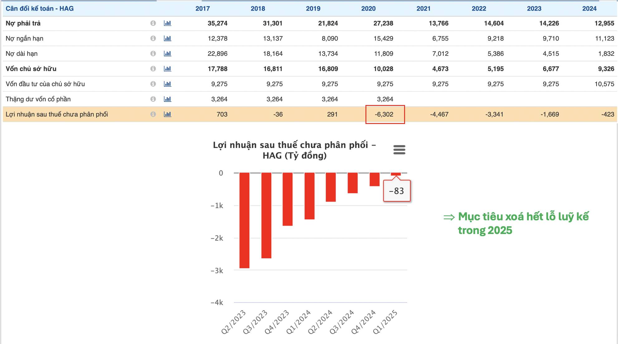 BCTC quý 1/2025 cho thấy lỗ lũy kế của HAG chỉ còn 82 tỷ đồng, trong khi đỉnh điểm vào năm 2020 con số này lên tới hơn 6.000 tỷ đồng.