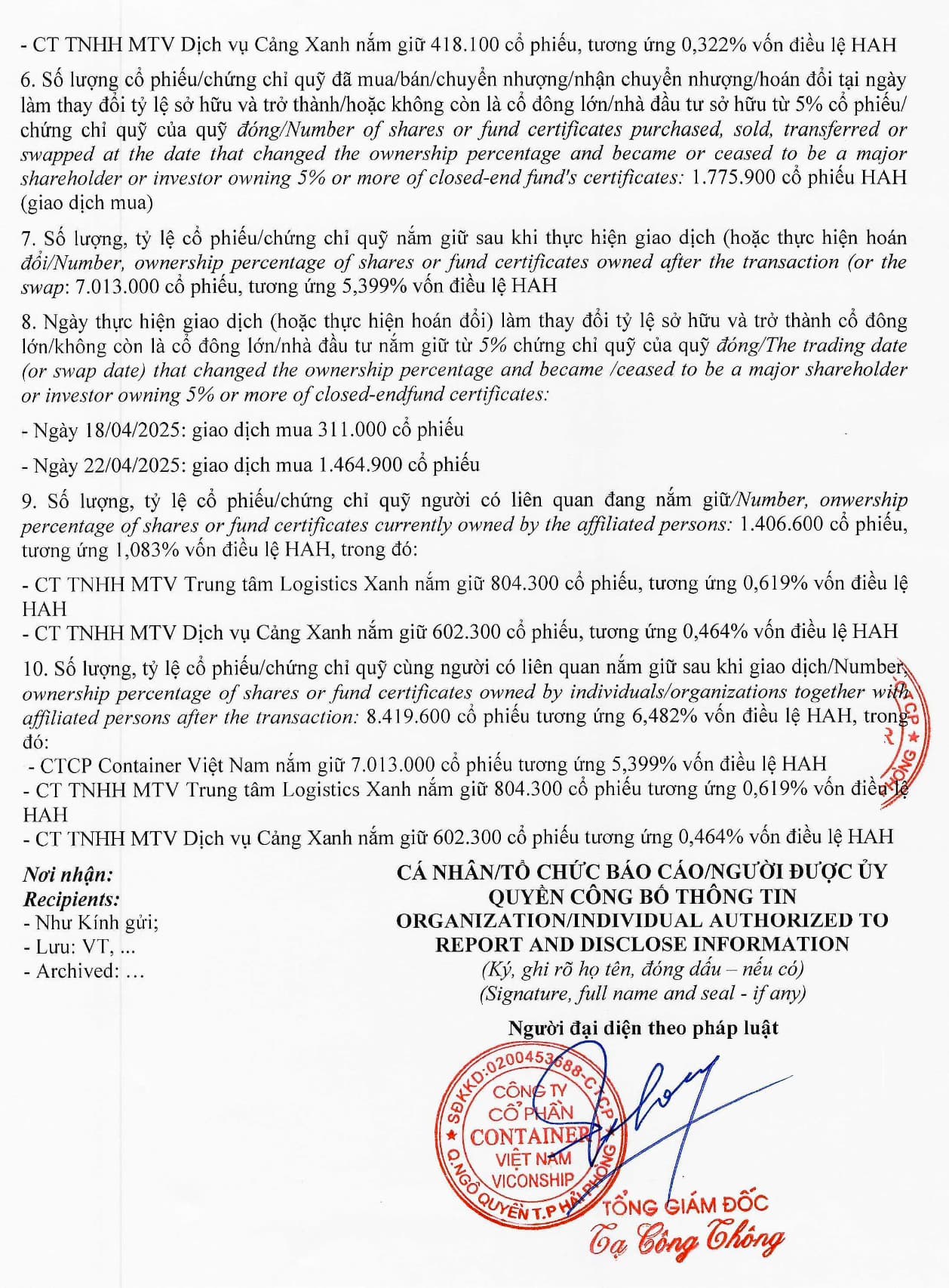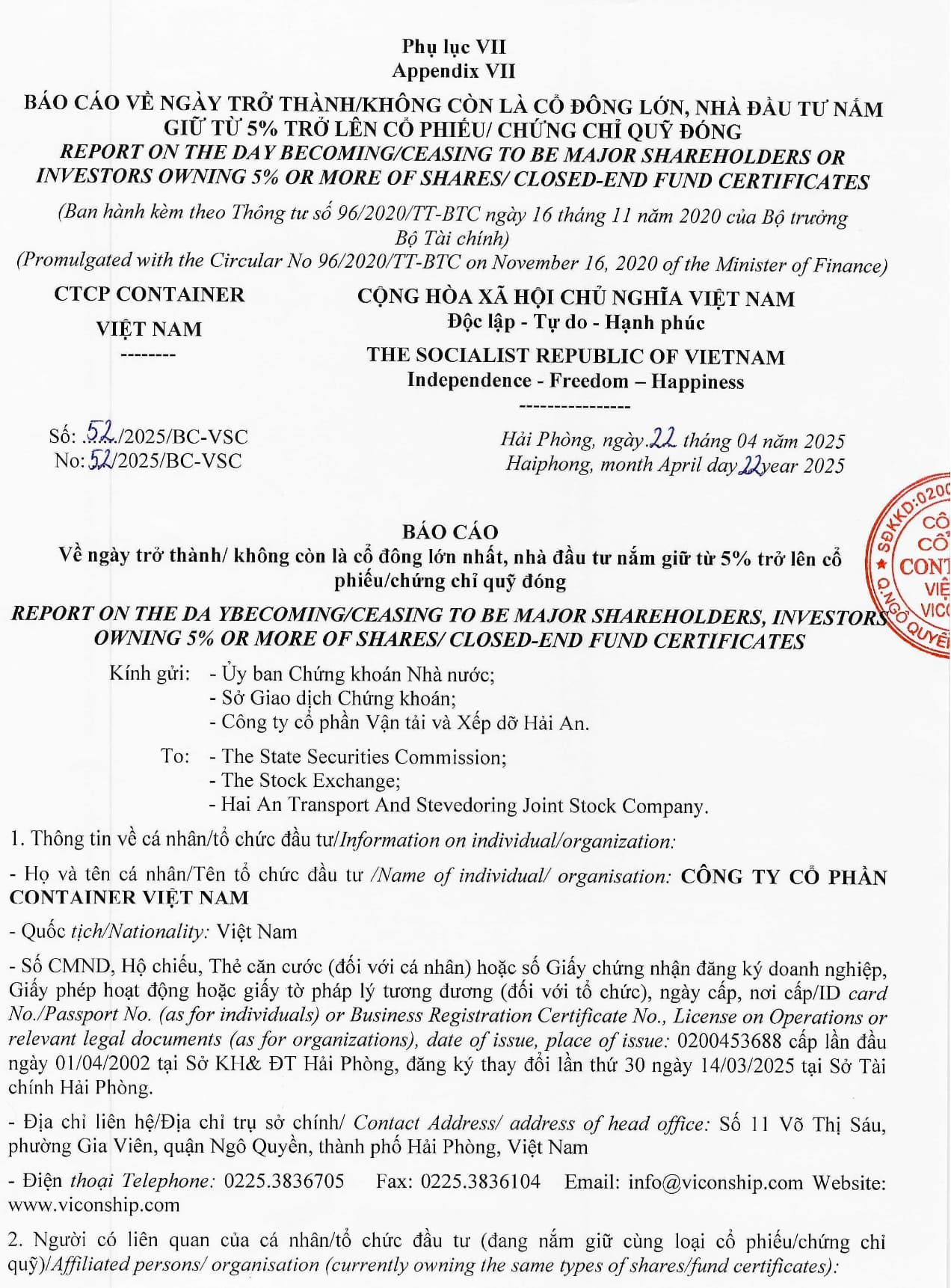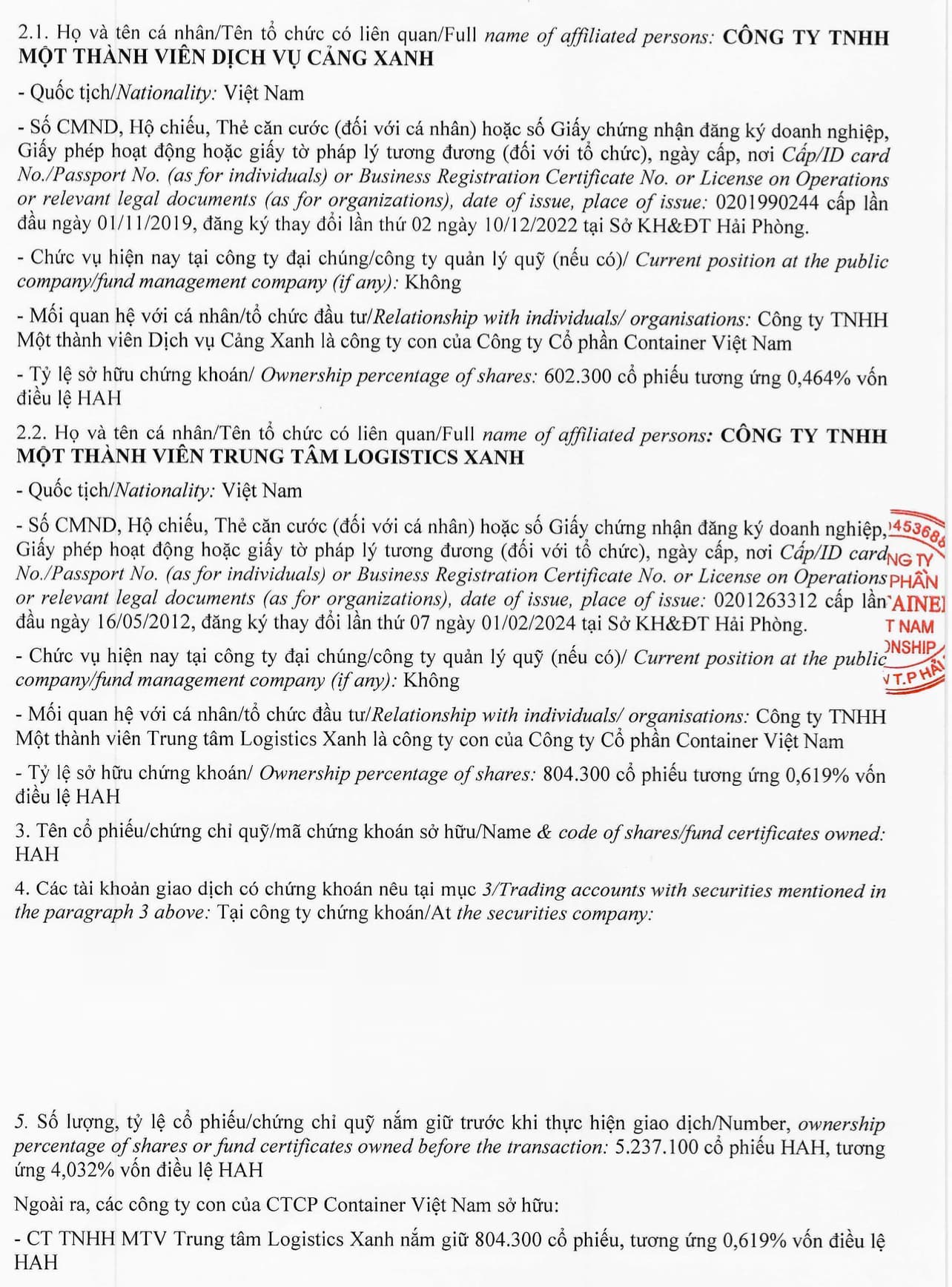 Tuy nhiên, một điều đáng chú ý hơn của giới đầu tư đó chính là CTCP Container Việt Nam (Viconship - VSC) đã công bố chính thức trở thành cổ đông lớn của HAH sau khi mua thêm hơn 2,15 triệu cổ phiếu vào ngày 30/1/2024, nâng tỷ lệ sở hữu từ 2,96% lên 5% vốn điều lệ .