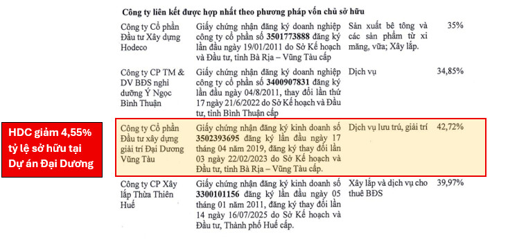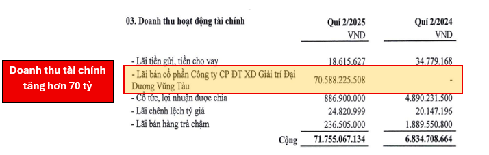 Theo BCTC quý 2/2025 của HDC, khoản mục đầu tư vào công ty liên kết ghi nhận tỷ lệ sở hữu của DN tại Công ty Cổ phần Đầu tư xây dựng giải trí Đại Dương Vũng Tàu là 42,72% (giảm 4,55%) so với thời điểm công bố BCTC quý 1/2025 và ghi nhận Doanh thu tài chính tăng mạnh hơn 70 tỷ đồng.
