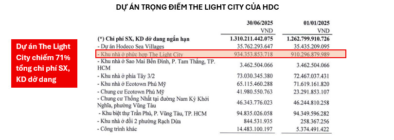 Tính đến cuối Q2/2025, giá trị HDC đã đầu tư vào The Light City là 934 tỷ, chiếm 71% trong cơ cấu chi phí sản xuất, kinh doanh dở dang ngắn hạn của doanh nghiệp.
