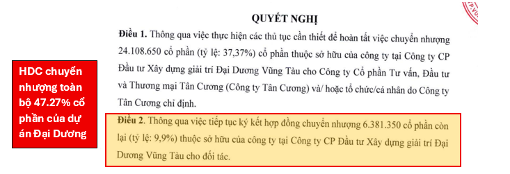 Trong tháng 7/2025, Công ty Cổ phần Phát triển Nhà Bà Rịa – Vũng Tàu (HDC) đã hoàn tất việc thoái toàn bộ vốn tại dự án Khu du lịch Đại Dương Vũng Tàu – dự án lớn với tổng vốn đầu tư 4.300 tỷ đồng và quy mô hơn 19 ha. HDC đã chuyển nhượng hết 47,27% cổ phần tại đơn vị sở hữu dự án cho hai đối tác, với giá trị thương vụ ước tính từ 1.100 – 1.200 tỷ đồng, và tổng giá trị hợp đồng có thể đạt tới 2.000 tỷ đồng tùy theo tiến độ thanh toán. Tính đến giữa năm, HDC đã nhận gần 170 tỷ đồng từ thương vụ này và dự kiến sẽ tiếp tục thu về thêm hơn 900 tỷ đồng trong 12 tháng tới.