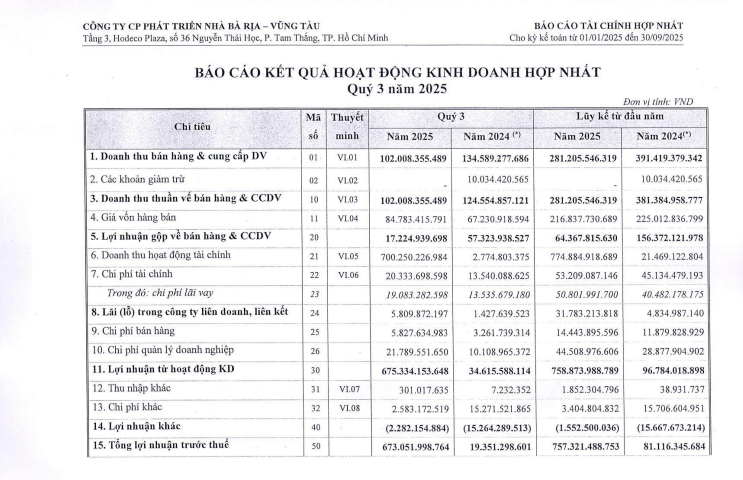 CTCP Phát triển Nhà Bà Rịa - Vũng Tàu (Hodeco, mã CK: HDC) cho biết tại ĐHĐCĐ bất thường 30/9, lợi nhuận trước thuế quý 3 ước 666 tỷ đồng, gấp 35 lần cùng kỳ. Cả năm 2025, HDC dự kiến đạt 755 tỷ đồng lợi nhuận trước thuế, tăng hơn 8 lần so với 2024, chủ yếu nhờ chuyển nhượng cổ phần dự án Khu du lịch Đại Dương tại phường Rạch Dừa, TP. Vũng Tàu.