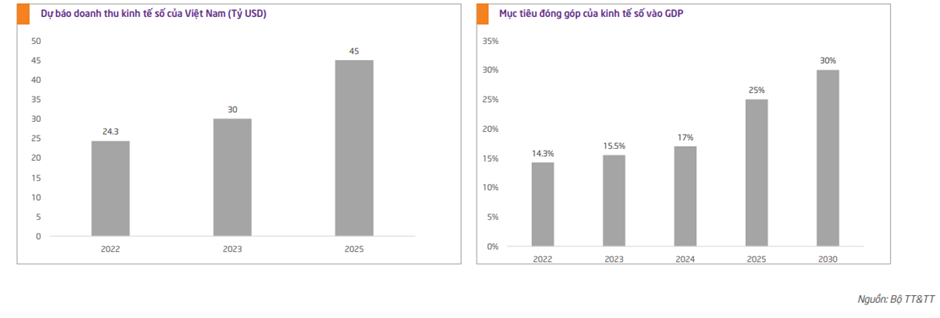 Các ngành trọng điểm có nhu cầu chuyển đổi số cao bao gồm: Dịch vụ Chuyên sâu và Bán lẻ; Cơ sở Hạ tầng; Dịch vụ Hành chính. Trong khi đó, Chứng khoán và Đầu tư sẽ có tốc độ tăng trưởng chi tiêu chuyển đổi số nhanh nhất với CAGR 5 năm là 20,6%, theo sát là Ngân hàng và Chăm sóc Sức khỏe với CAGR lần lượt là 19,4% và 19,3%. Các lĩnh vực quan trọng khác tiếp tục phát triển và góp phần thúc đẩy nền kinh tế số của Việt Nam bao gồm ngành: Vận tải; Thực phẩm (dịch vụ giao đồ ăn); Truyền thông trực tuyến. Lĩnh vực này đã tăng trưởng 10% từ 2022 đến 2023, dự kiến CAGR tăng 16% trong giai đoạn từ năm 2023 đến năm 2025 và dự báo đạt 4 tỷ USD vào năm 2025.