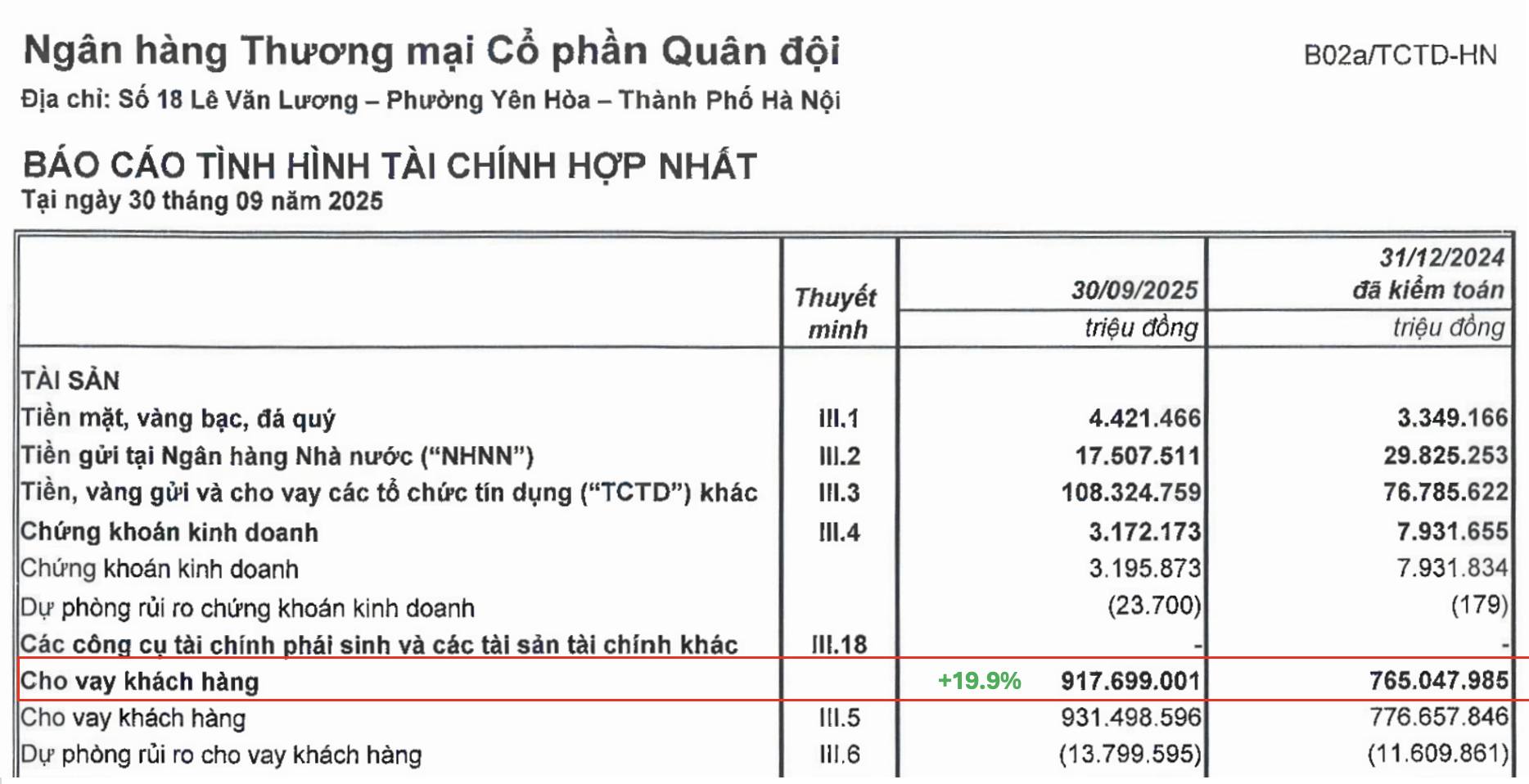 • Đến hết Q3/2025, tăng trưởng tín dụng của MBB đạt gần 20%, vượt xa mức bình quân ngành 13,4%.