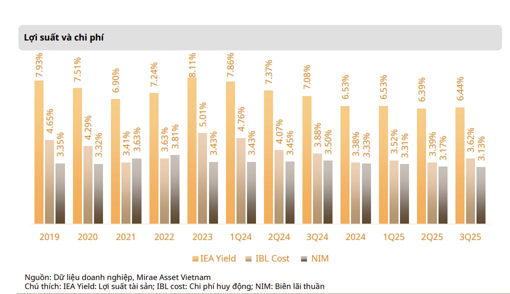 - Biên lãi thuần (NIM) tiếp tục thu hẹp tại các NHNY nhưng với biên độ nhỏ dần. Trong Q3/2025, NIM các NHNY giảm nhẹ 4đcb QoQ xuống 3.13%, lũy kế 9T2025 chỉ số này giảm khoảng 20đcb.