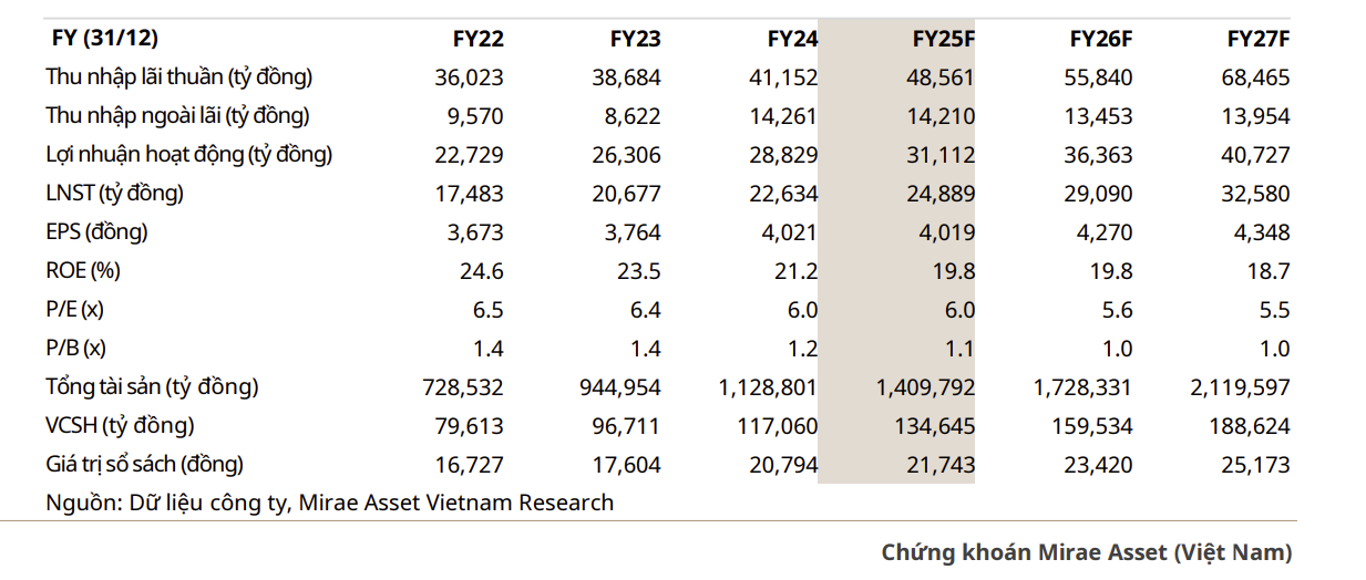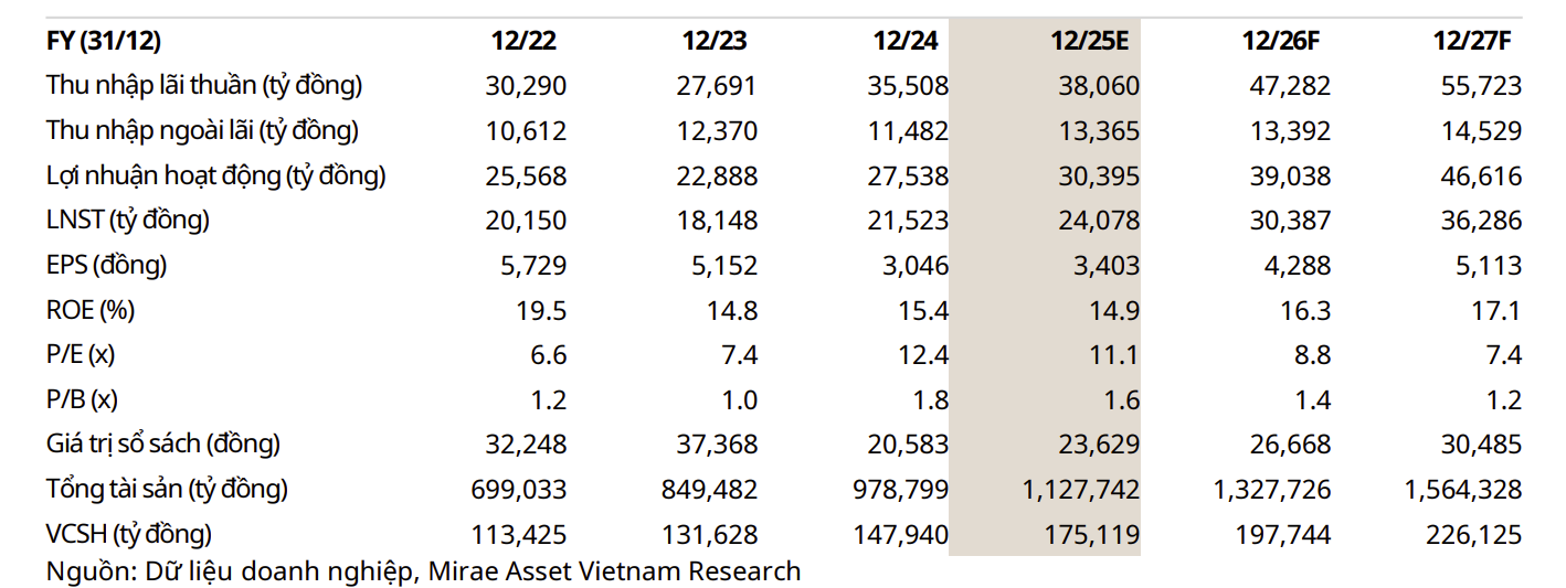 - Dự phóng 2026F: NII dự kiến đạt 55,840 tỷ (+15% svck); NFI 5,385 tỷ (+11.5% svck); LNTT 36,363 tỷ (+16.9% svck), với tăng trưởng tín dụng và ROE duy trì ổn định.