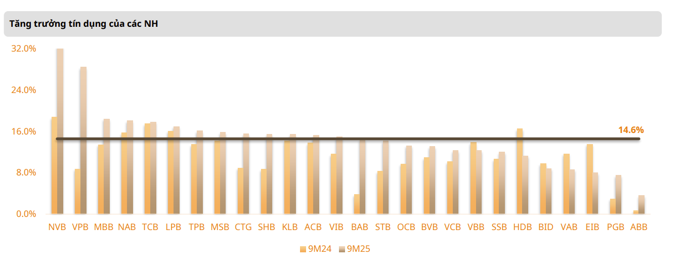 - Khối NH niêm yết tiếp tục vượt trội, với tăng trưởng tín dụng hợp nhất đạt 14.6% trong 9T2025. Ngoại trừ một số trường hợp cá biệt, mức phân hóa không lớn, cho thấy đà mở rộng tương đối đồng đều trong toàn ngành.