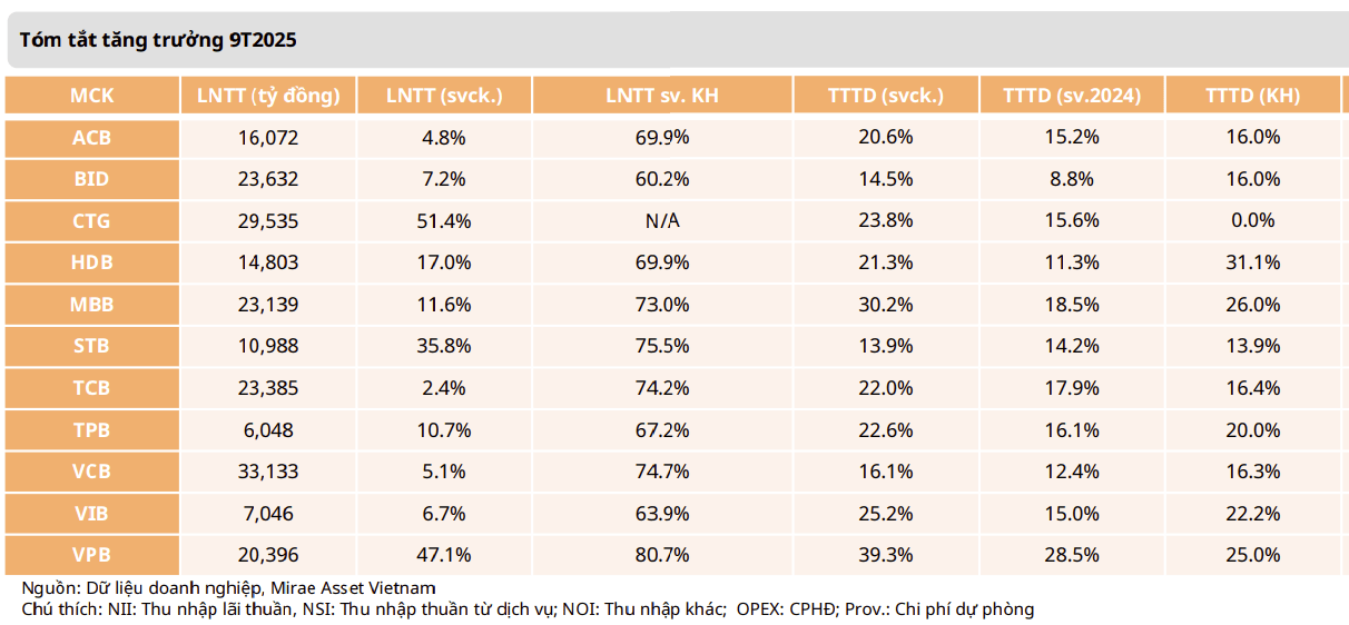 - LNTT tăng trưởng trở lại trong Q3/2025, tăng 14.4% svck với sự hồi phục đồng bộ từ các nguồn thu nhập như NII (+11.2%), NSI (+16.4%), và NOI (+133.4%)