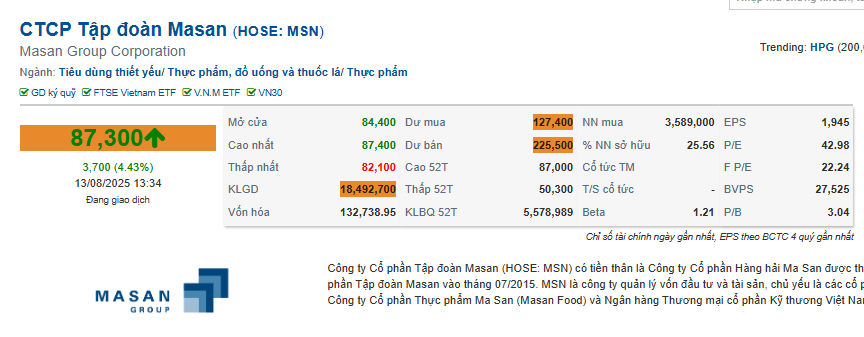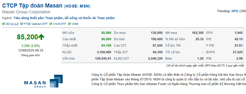 Tháng 8/2025, Masan (MSN) ghi nhận doanh thu WinCommerce đạt khoảng 3.573 tỷ đồng, tăng 24,2% so với cùng kỳ, với doanh thu trên cửa hàng hiện hữu tăng 11,9%. Chuỗi WinMart và WinMart+ đã mở thêm 60 cửa hàng WinMart+ và 1 cửa WinMart trong tháng, nâng tổng số cửa hàng mới từ đầu năm lên 414. Lũy kế 8 tháng, doanh thu WinCommerce ước đạt khoảng 25.000 tỷ đồng, tăng 16,1% so với cùng kỳ, với mức tăng trưởng doanh thu cùng cửa hàng đạt 8,2%, tiếp tục củng cố vị thế dẫn đầu trong bán lẻ hiện đại .