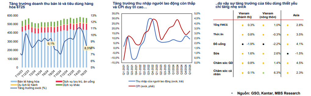 Trong 6T.2025, doanh thu bán lẻ và tiêu dùng hàng hóa tăng 9.3% svck, cao hơn mức trung bình cả năm 2024 (8.6%), cho thấy tín hiệu phục hồi tích cực nhưng vẫn thấp hơn so với giai đoạn trước dịch. Tuy nhiên, sức mua còn yếu, thể hiện qua mức tăng trưởng FMCG chỉ +0.3% ở thành thị và +1% ở nông thôn, thấp hơn trung bình khu vực châu Á. Nguyên nhân chính đến từ CPI duy trì quanh 3% và lo ngại tác động của thuế quan đến xuất nhập khẩu.