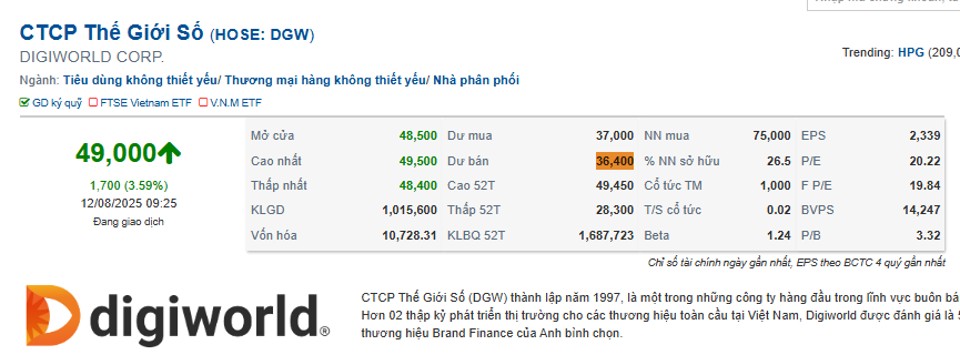 Trong tháng 9/2024, Digiworld (DGW) hưởng lợi rõ rệt từ đợt ra mắt iPhone 16, khi mảng điện thoại di động tăng trưởng khoảng 26% so với cùng kỳ và kéo tổng doanh thu quý 3 lên khoảng 6.226 tỷ đồng (+15% yoy), lợi nhuận sau thuế đạt 122 tỷ (+19%). Ngoài iPhone 16, doanh số từ Xiaomi, thiết bị văn phòng (+27%), cùng một số mảng gia dụng và tiêu dùng cũng góp phần duy trì đà tăng trưởng. Để đạt kết quả này, DGW đã tăng chi phí tiếp thị và hỗ trợ bán hàng, nhưng biên lợi nhuận vẫn được giữ ở mức tốt. Với đợt iPhone 17 năm nay, lượng đặt trước kỷ lục và nhu cầu nâng cấp cao dự kiến sẽ tiếp tục thúc đẩy mảng điện thoại, tạo hiệu ứng lan tỏa sang phụ kiện và các sản phẩm khác, đồng thời có thể kéo theo chi phí marketing lớn hơn, nhưng nhìn chung triển vọng tăng trưởng của DGW trong quý 3–4/2025 vẫn rất tích cực.