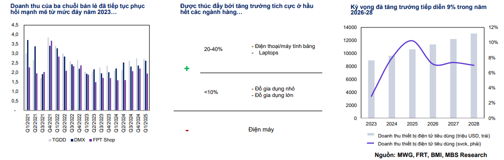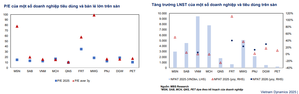 Giai đoạn 2025–2026, nhu cầu tiêu dùng thiết yếu dự báo đi ngang khi tác động COVID-19 đã hết nhưng nền kinh tế lại chịu ảnh hưởng từ các mức thuế quan mới tại Mỹ. Ngược lại, nhóm ICT-CE dự kiến tăng trưởng doanh thu một chữ số từ nền thấp, giúp lợi nhuận bật tăng khoảng 45% so với cùng kỳ. Trong khi đó, mảng bán lẻ tạp hóa sau khi đạt điểm hòa vốn vào năm 2024 sẽ bước vào giai đoạn mở rộng với tốc độ mở mới khoảng 18% mỗi năm. Về chiến lược đầu tư, ưu tiên các doanh nghiệp có định giá hấp dẫn và tăng trưởng khoảng 40% svck, tiêu biểu là MWG, MSN, DGW, PET còn trong trung hạn từ 2026, khi dự thảo nới lỏng nhập khẩu vàng có hiệu lực, PNJ sẽ được đưa vào danh mục nhờ có thêm nguồn lực để sản xuất và cung ứng.