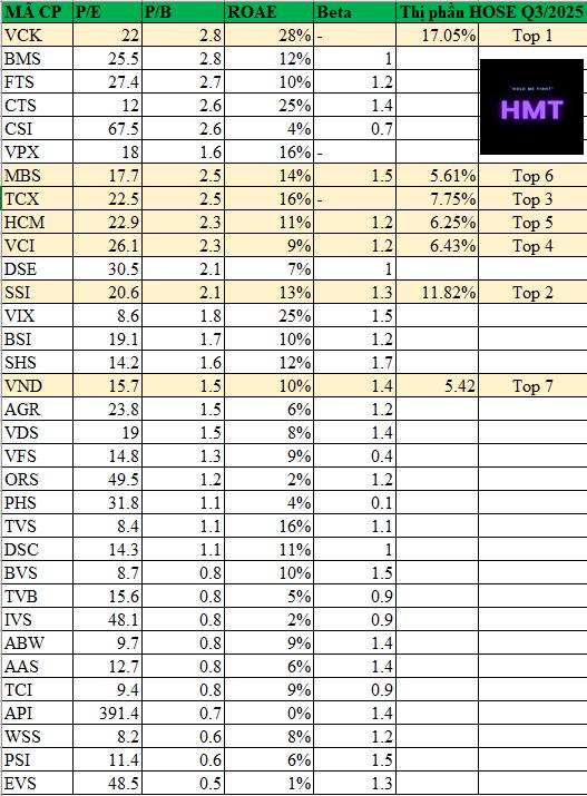 - Nhìn vào TOP 7 công ty chứng khoán có thị phần lớn nhất đang niêm yết, chúng ta hoàn toàn có thể đánh giá được P/B cổ phiếu nào đang hấp dẫn nhất.