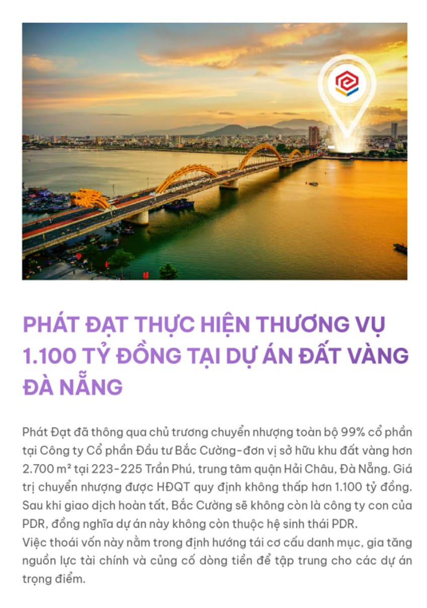 - Các dự án vùng ven: PDR sẽ tiếp tục triển khai và bán các dự án theo đúng định hướng trong ĐHCĐ 2025 – Trung tâm TP.HCM và Đồng Nai. Với pháp lý đã khơi thông, quỹ đất sẵn có, năng lực cũng đã được chứng minh bởi các La Pura, Quy Nhơn Iconic… Dự kiến từ năm 2026 Phát Đạt sẽ tung ra nhiều sản phẩm mới.