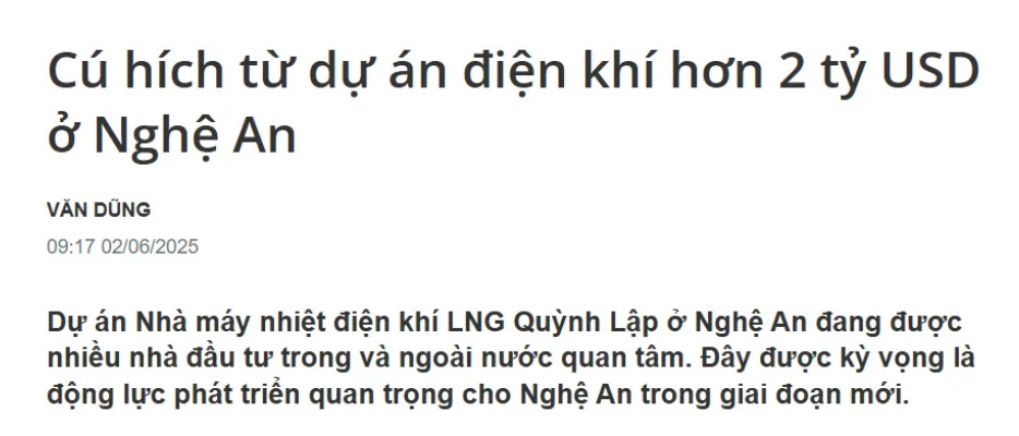 - Mới đây ngày 2/6/2025 có tin Nhà máy nhiệt điện khí LNG Quỳnh Lập tại thị xã Hoàng Mai (Nghệ An) là một trong 14 dự án nhiệt điện khí thuộc danh mục các công trình nguồn điện quan trọng, được ưu tiên đầu tư đến năm 2030.