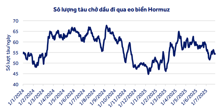 Hoạt động vận tải dầu qua eo Hormuz chưa bị ảnh hưởng nhiều bởi căng thẳng địa chính trị . Số lượt tàu chở dầu đi qua eo biển này – nơi chiếm khoảng 30% giao dịch dầu thô và sản phẩm dầu toàn cầu – vẫn chưa ghi nhận sự gián đoạn đáng kể. Tuy vậy, lưu lượng tàu trong năm 2025 có xu hướng giảm nhẹ so với 2024, phản ánh sự trầm lắng chung của thị trường dầu .